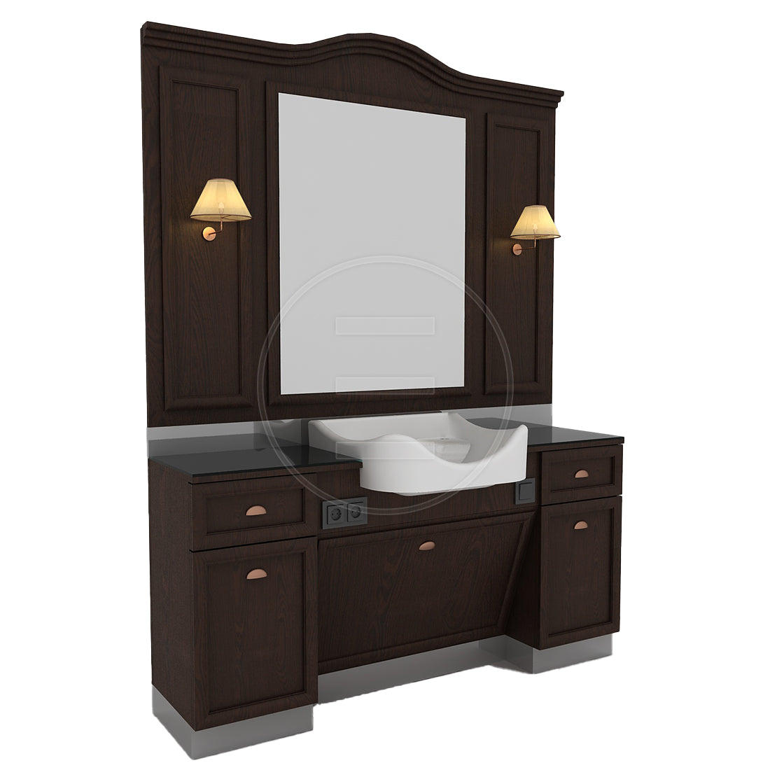 Es ist mit Funktionen wie MDF-Lam-Membrankörper, Float-Spiegel, Edelstahlsockel und Keramikspüle ausgestattet. Während die Lampenschirmbeleuchtung und die Glasoberfläche in Marmoroptik der Theke einen modernen Touch verleihen, sorgen die Schubladen und Türen am rechten und linken Nachttisch für eine einfache Bedienung.