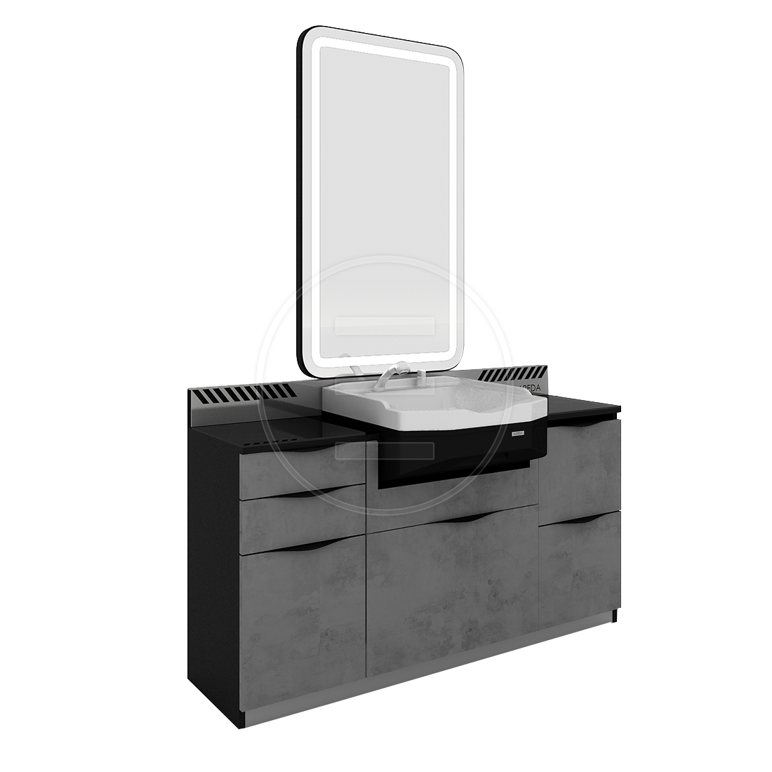 Während es seinen Benutzern dank seines ergonomischen, beweglichen Waschbeckens Komfort und Funktionalität bietet, betont es Qualität durch seine lasergeschnittene Fußleiste aus glänzendem Edelstahl. Darüber hinaus verfügt der Float-Spiegel über LEDs von vorne und lässt sich durch Berührung von der Seite öffnen und schließen. Es enthält nützliches Zubehör wie einen Sensor-LED-Organizer, eine Schublade mit Serviertablett und einen Shampoo-Aufbewahrungsbereich.