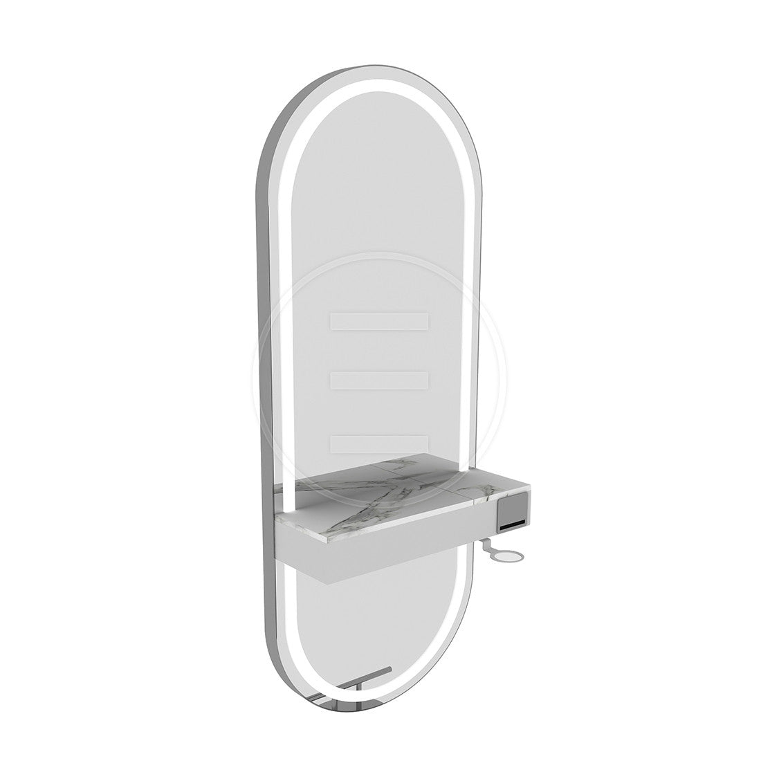Die Friseurtheke GLAM Wall Nk zeichnet sich durch ihre Ellipsenform und die raffinierte LED-Beleuchtung aus, die unseren bahnbrechenden Designansatz widerspiegelt und den Salons mit ihrem Edelstahlrahmen und dem mattierten Floatspiegel Eleganz verleiht.