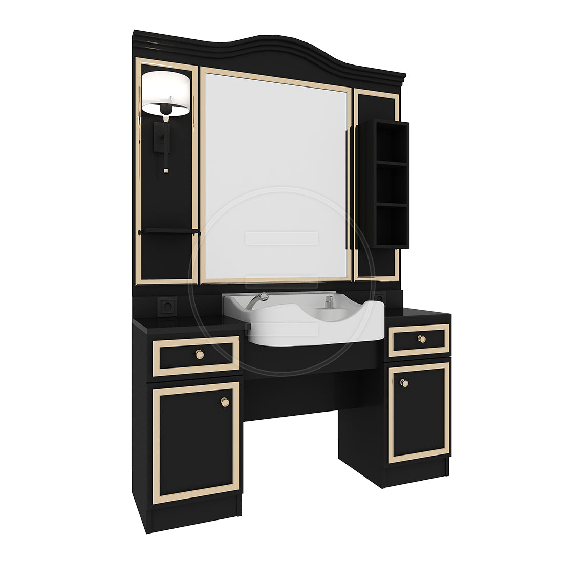 GOLDEN MAN barber bench combines luxury and elegance! This bench, which attracts attention with its high quality MDF body and gold details, is a perfect option for professional barbers. It offers ease of use and aesthetics with its flotal mirror, fixed blow dryer and wide design.