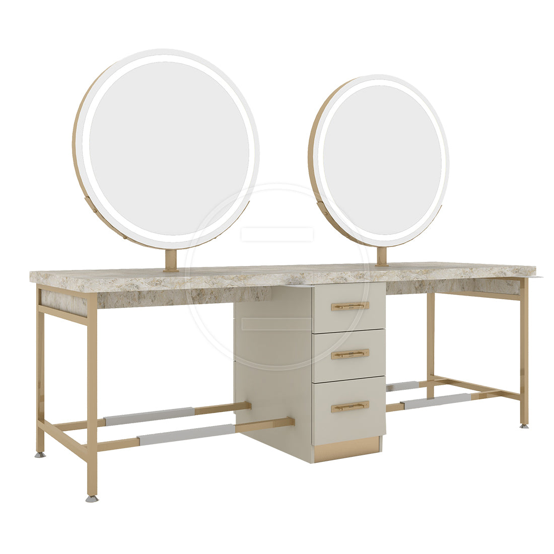 Der aus MDF-Laminatmaterial gefertigte Korpus wird auch im oberen Tisch- und Spiegelbereich verwendet und sorgt durch seine Haltbarkeit und langlebige Nutzung für Sicherheit. Während die LED-Beleuchtung und die Mattierung des Spiegels für ein auffälliges Erlebnis sorgen, erhöhen die mit elektrostatischer Pulverfarbe beschichteten Metallbeine auch die Stabilität. Das Steckdosen- und Tandemschienen-Schubladensystem an der Unterseite sorgt für Ordnung und erweitert den Nutzungsbereich.