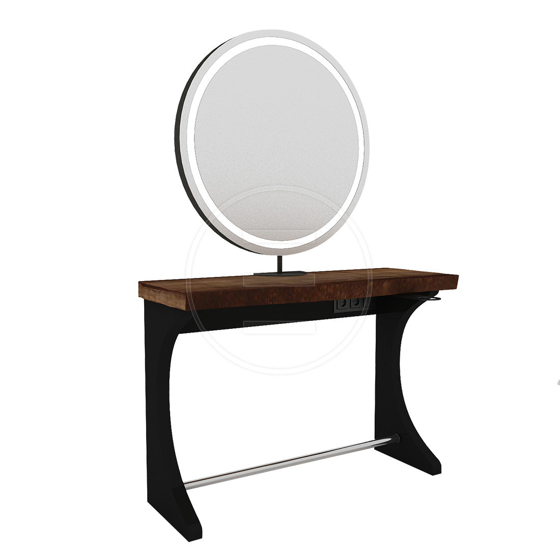Der Korpus ist hochwertig verarbeitet und die Tischplatte besteht aus Massivholz. (Alternativ ist auch die Option MDF-Lam erhältlich). Die Beine bestehen aus elektrostatisch pulverbeschichtetem Laserblech. Unter dem Tisch befindet sich außerdem eine versteckte Steckdose. Der Spiegel besteht aus Floatspiegel mit LED-Beleuchtung und Mattierung. Die Fußstütze besteht aus Edelstahlrohr.