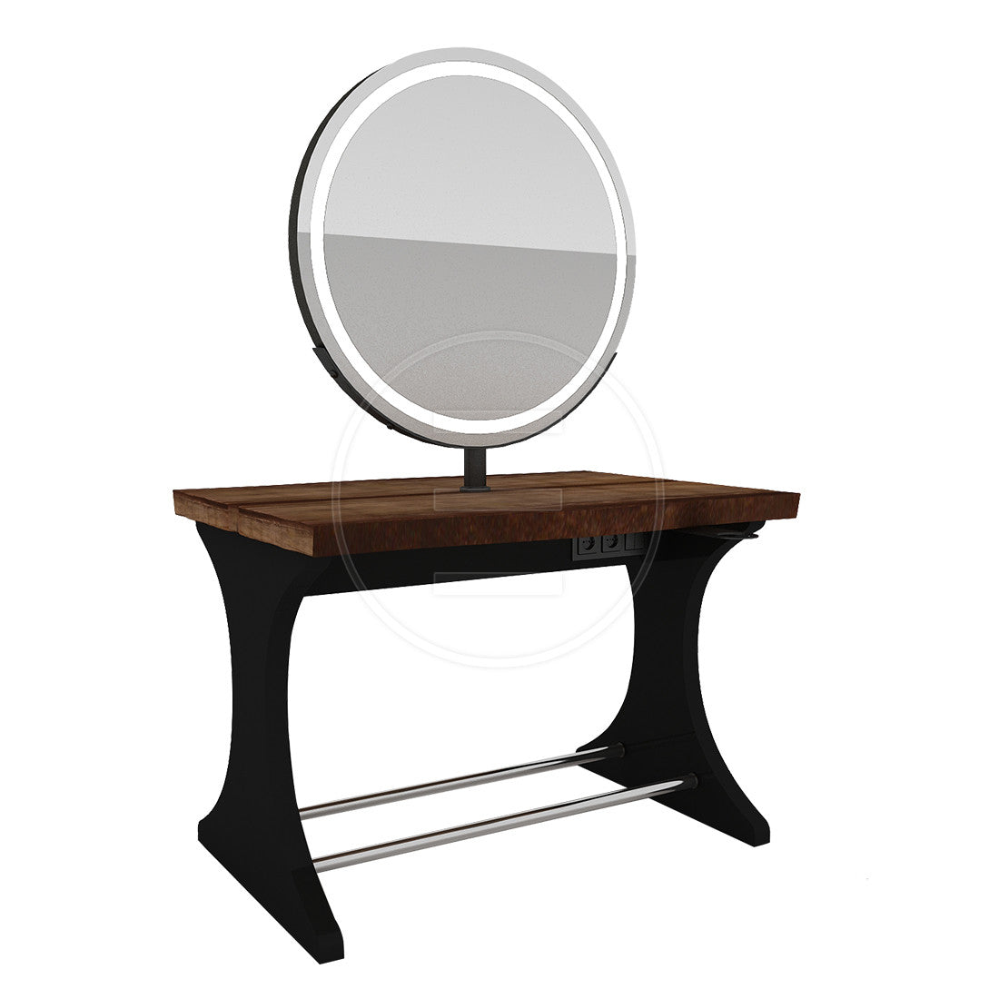 Der Korpus ist hochwertig verarbeitet und die Tischplatte besteht aus Massivholz. (Alternativ ist auch die Option MDF-Lam erhältlich). Die Beine bestehen aus elektrostatisch pulverbeschichtetem Laserblech. Unter dem Tisch befindet sich außerdem eine versteckte Steckdose. Der Spiegel besteht aus Floatspiegel mit LED-Beleuchtung und Mattierung. Die Fußstütze besteht aus Edelstahlrohr.
